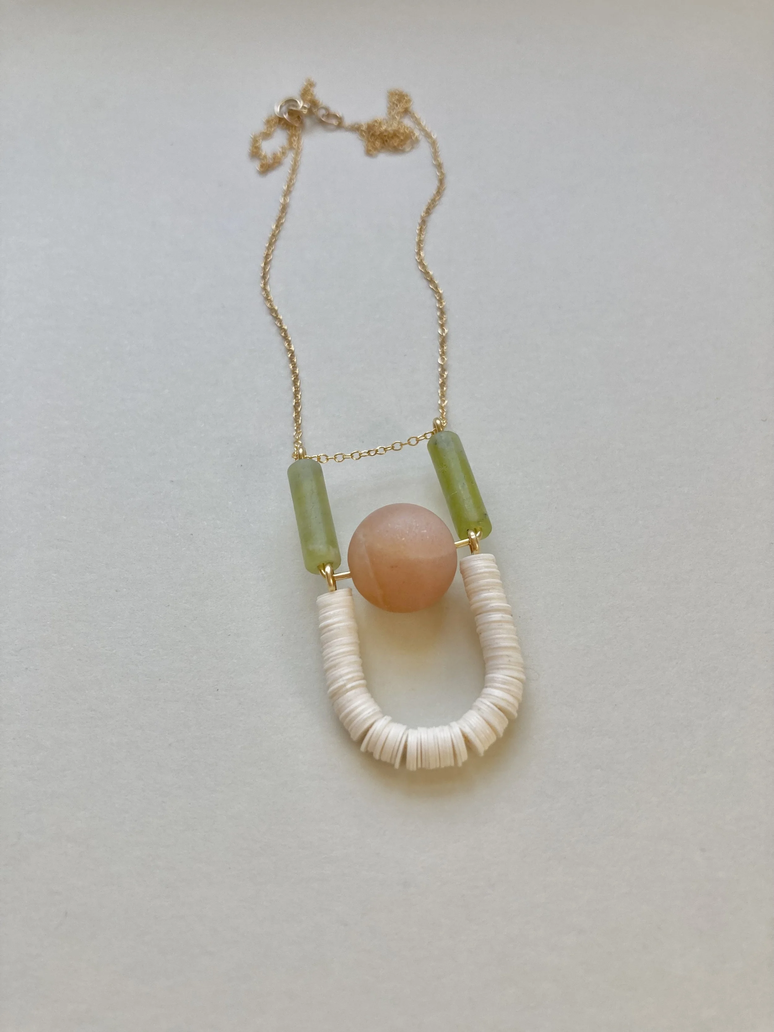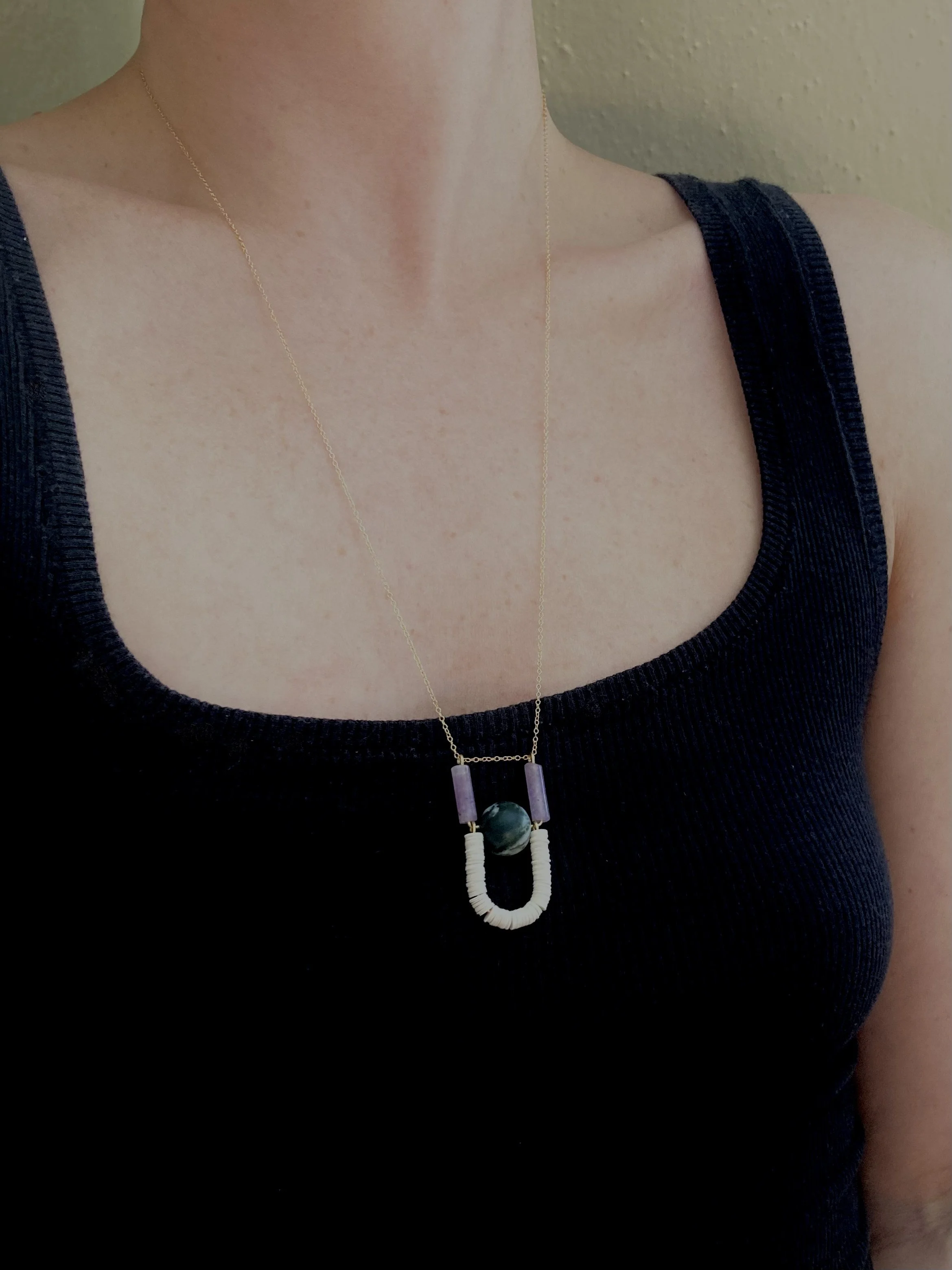 The Object pendant is inspired by modern, minimal shapes and palettes. Choose from two contemporary combinations of gemstones and recycled vinyl beads for a look both eye-catching and versatile.